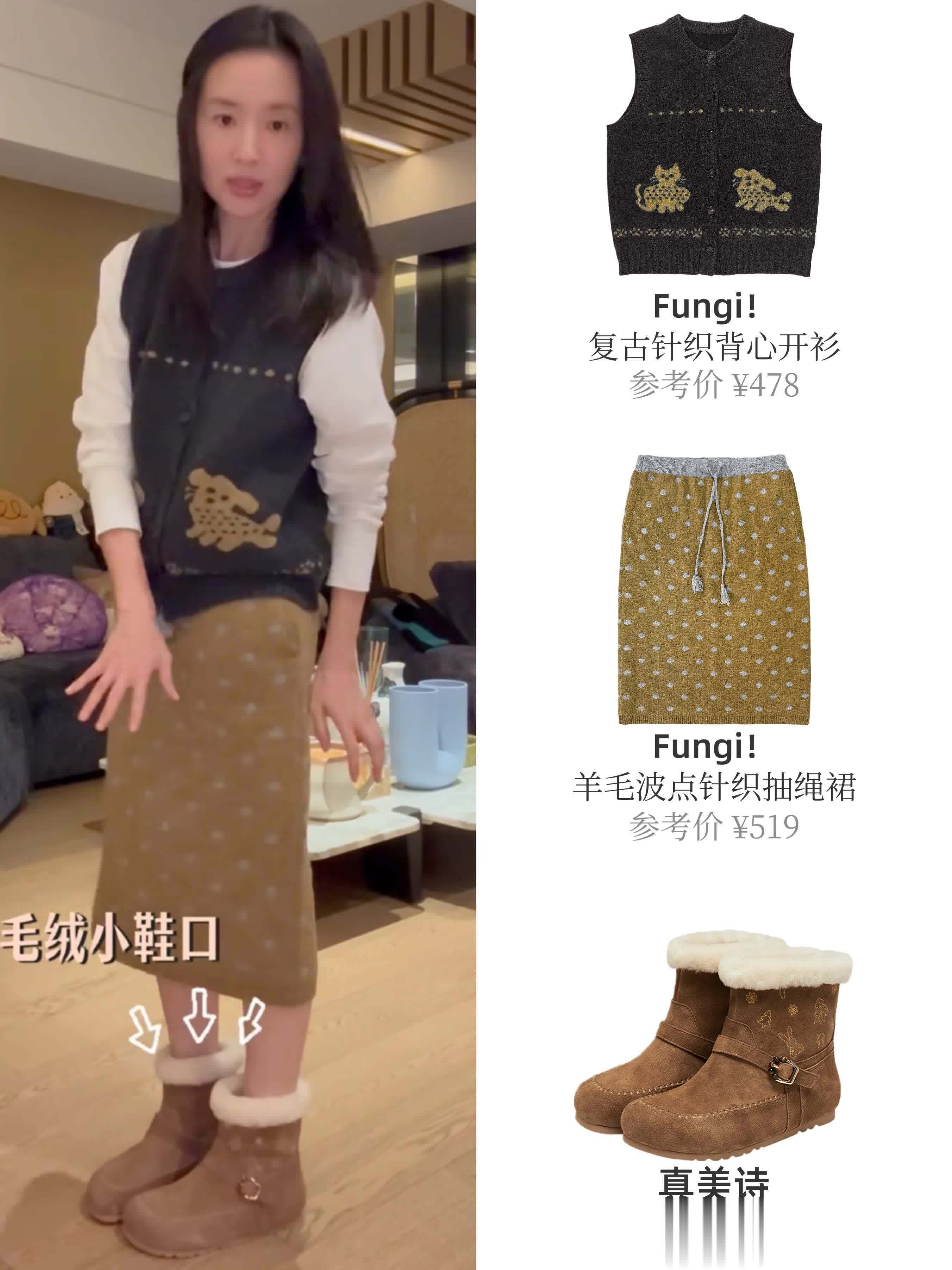 先说那套“复古背心+白长袖+波点半裙”,看着软乎乎的像只小兔子!复古背心是浅卡其色的针织款,纹路是细细的坑条,单看平平无奇,搭在白色长袖外面就很妙——领口和袖口露出一小圈白边,层次感一下就出来了,不会显得单调。下半身的波点半裙是黑底白圆点,圆点不大不小刚好合适,长度到膝盖上方,走路时轻轻晃,俏皮又不幼稚。最绝的是脚上那双棕色雪地靴,看着胖乎乎的却不笨重,鞋口是软软的翻边设计,和整套温柔风搭一起,像冬天揣着热奶茶的邻家姐姐,去超市买东西或者带娃出门,舒服又好看,完全没有“刻意打扮”的紧绷感。