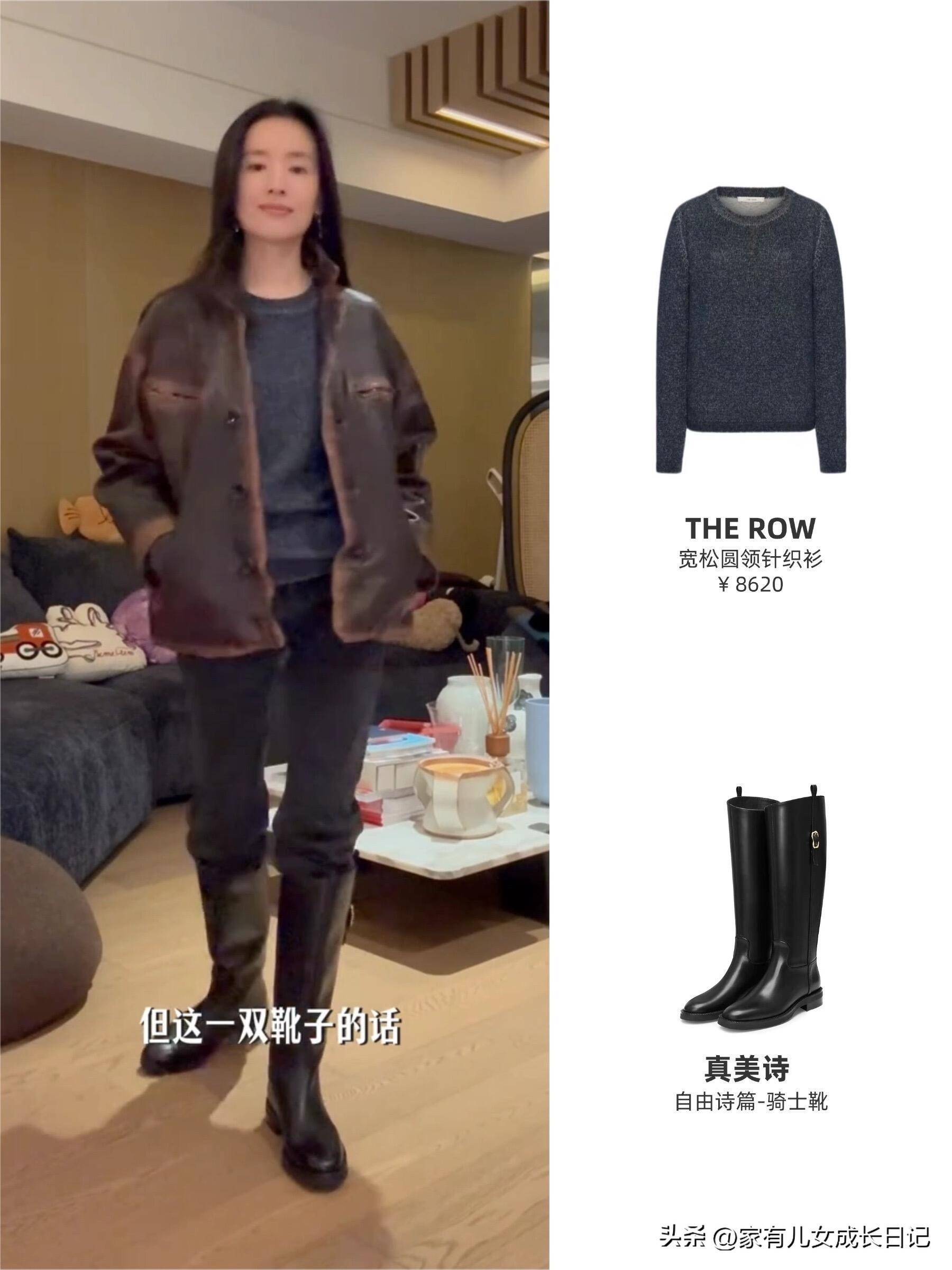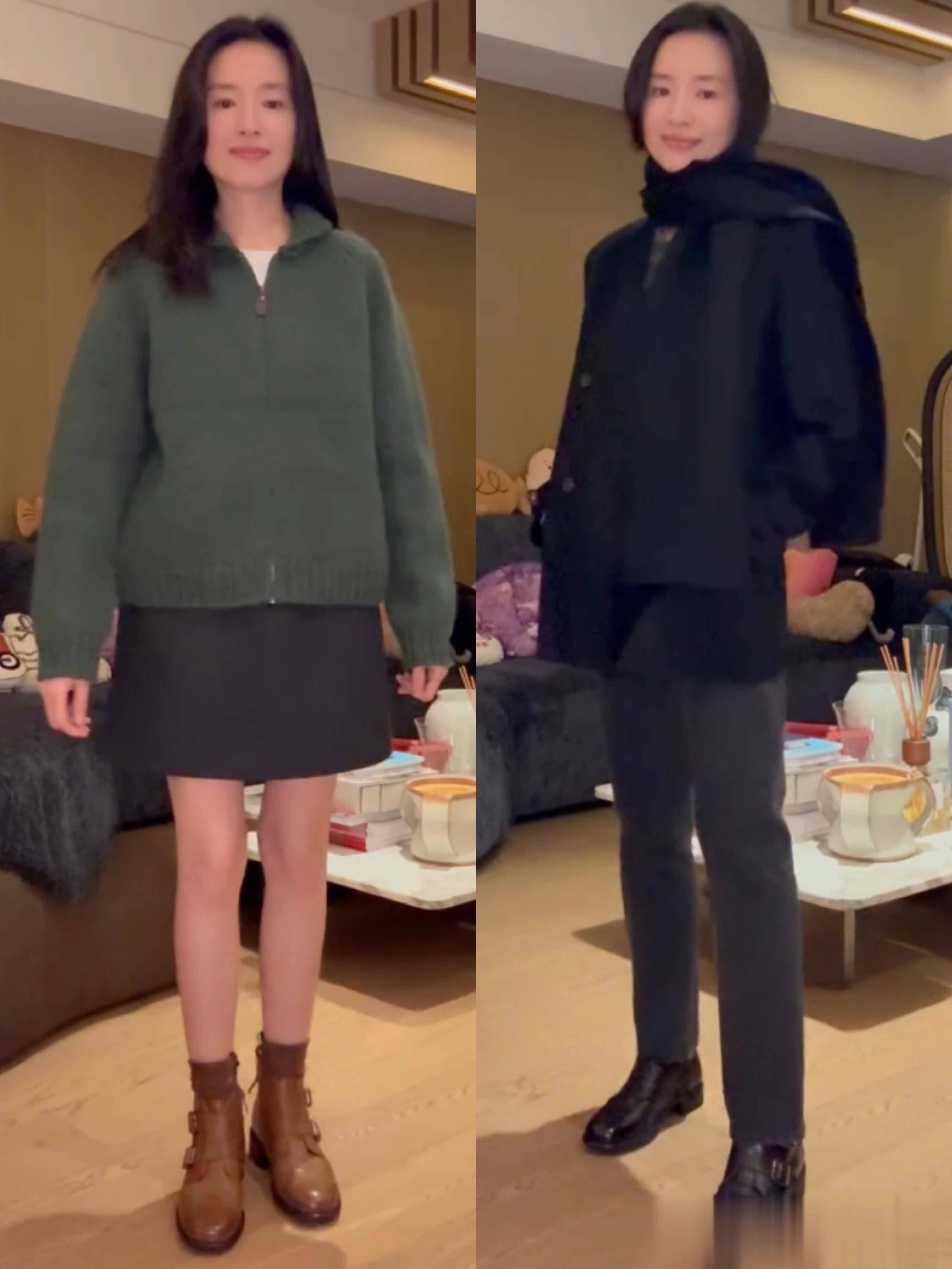 工装外套那套直接把比例拉成“三七分”!卡其色工装外套是短款的,版型有点硬挺但不压肩,里面叠穿了件红绿格纹衬衫,衬衫领口和下摆都露出来一点,瞬间中和了工装的硬朗。下半身看不清具体穿了啥,但光看腿就知道是“小心机”——长筒靴直接拉到大腿根,靴筒紧紧裹着小腿,显得腿又细又直,视觉上把腿长拉到腰,160穿出170的既视感。董洁把外套下摆塞进裤子(或者靴子里),腰线上提了一大截,配上格纹衬衫的复古调,酷飒中带着点慵懒,去逛市集或者看展穿,回头率绝对高,完全不像“明星摆拍”,更像和朋友逛街随手拍的生图。
