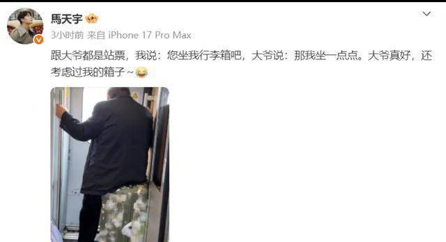 最近,演员马天宇在社交平台晒出了一段高铁经历,直接把网友笑到捶床。他买了站票,在车厢里站得脚酸,看见旁边同样站着的大爷,于心不忍,就主动把自己的行李箱推过去:“您坐我行李箱吧。”