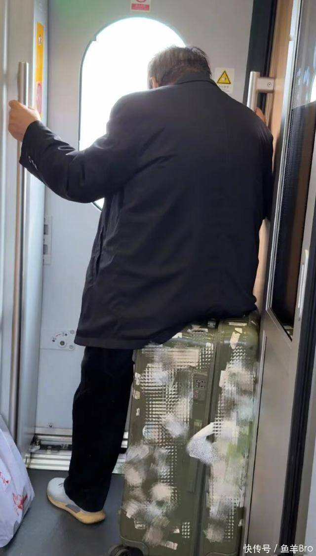 照片里,他没戴口罩,没摆明星架子,就跟个普通打工人一样,在高铁车厢里站着。旁边的大爷穿着黑色外套,背对着镜头,一只手抓着车厢扶手,另一只手搭在行李箱上,屁股只沾了个边,生怕把人家的箱子坐坏了。